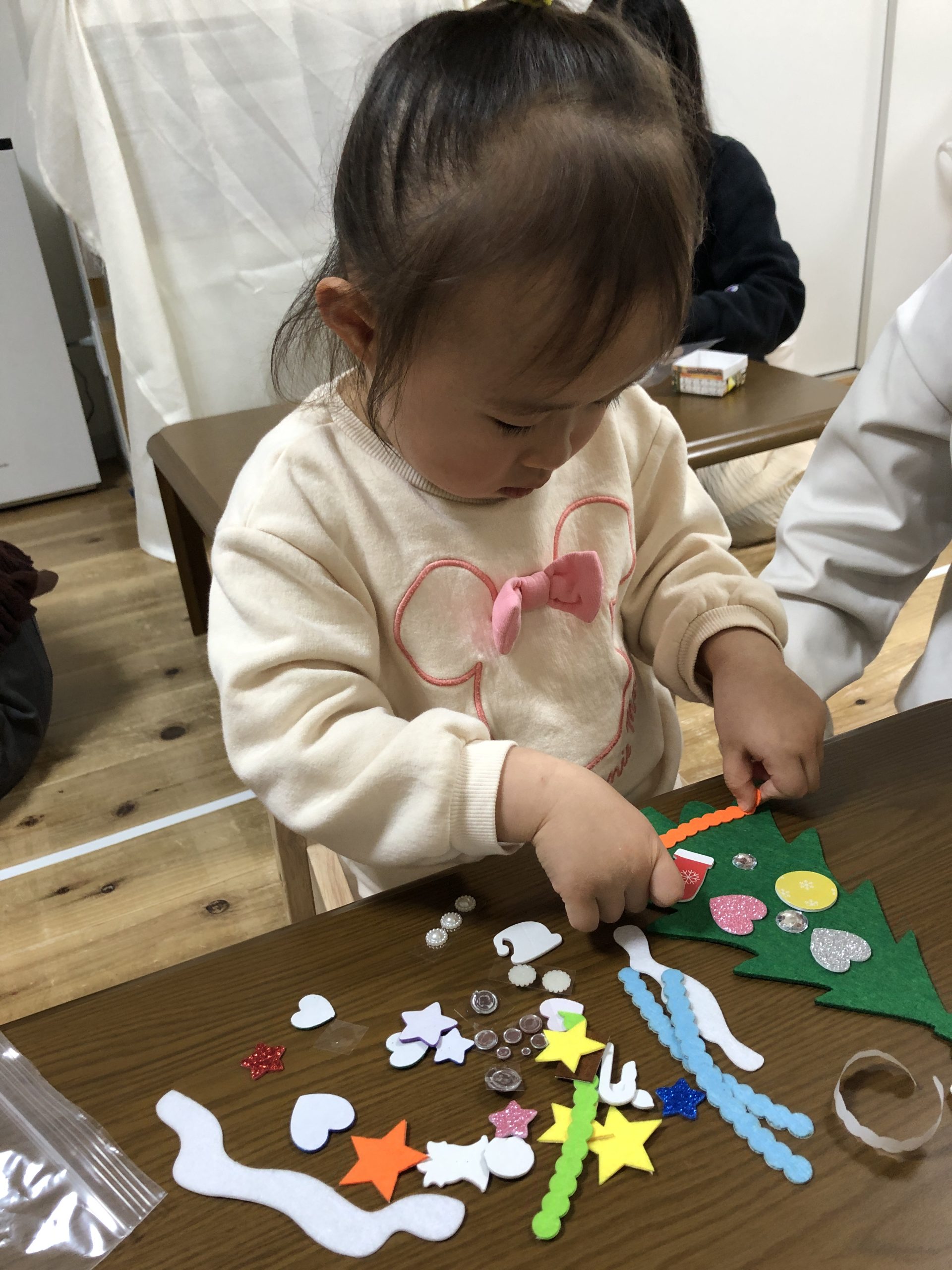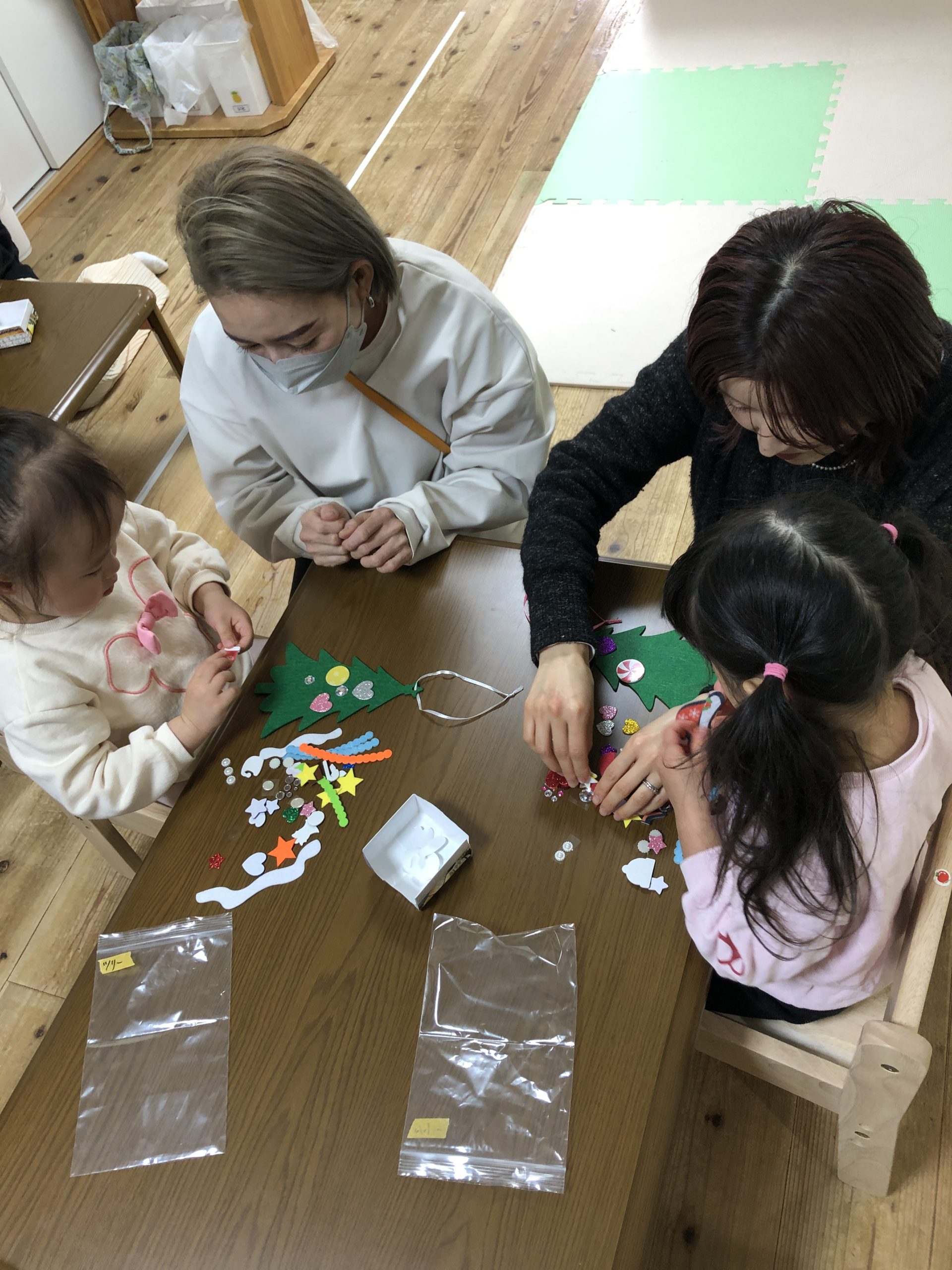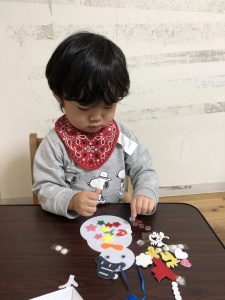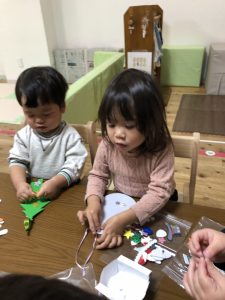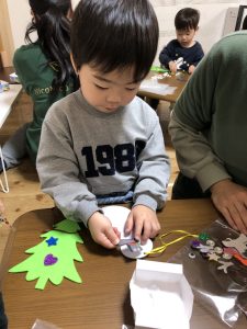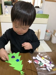 少し小さいシールだったのですが、みんな指先を上手に使いシールを剥がしツリーや雪だるまにシールを貼り一人ひとりの個性がでる素敵な作品が出来上がりました✨
