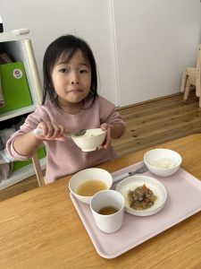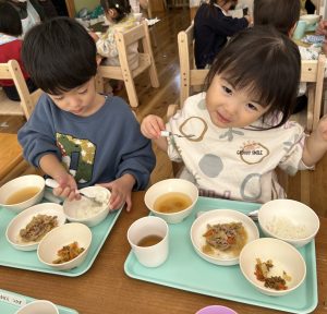 この日の給食は白菜のうま煮、マカロニのカレーソテー、味噌汁でした。2歳児さんは上手に食べることができるようになり、エプロンをつけずに食べています❣️