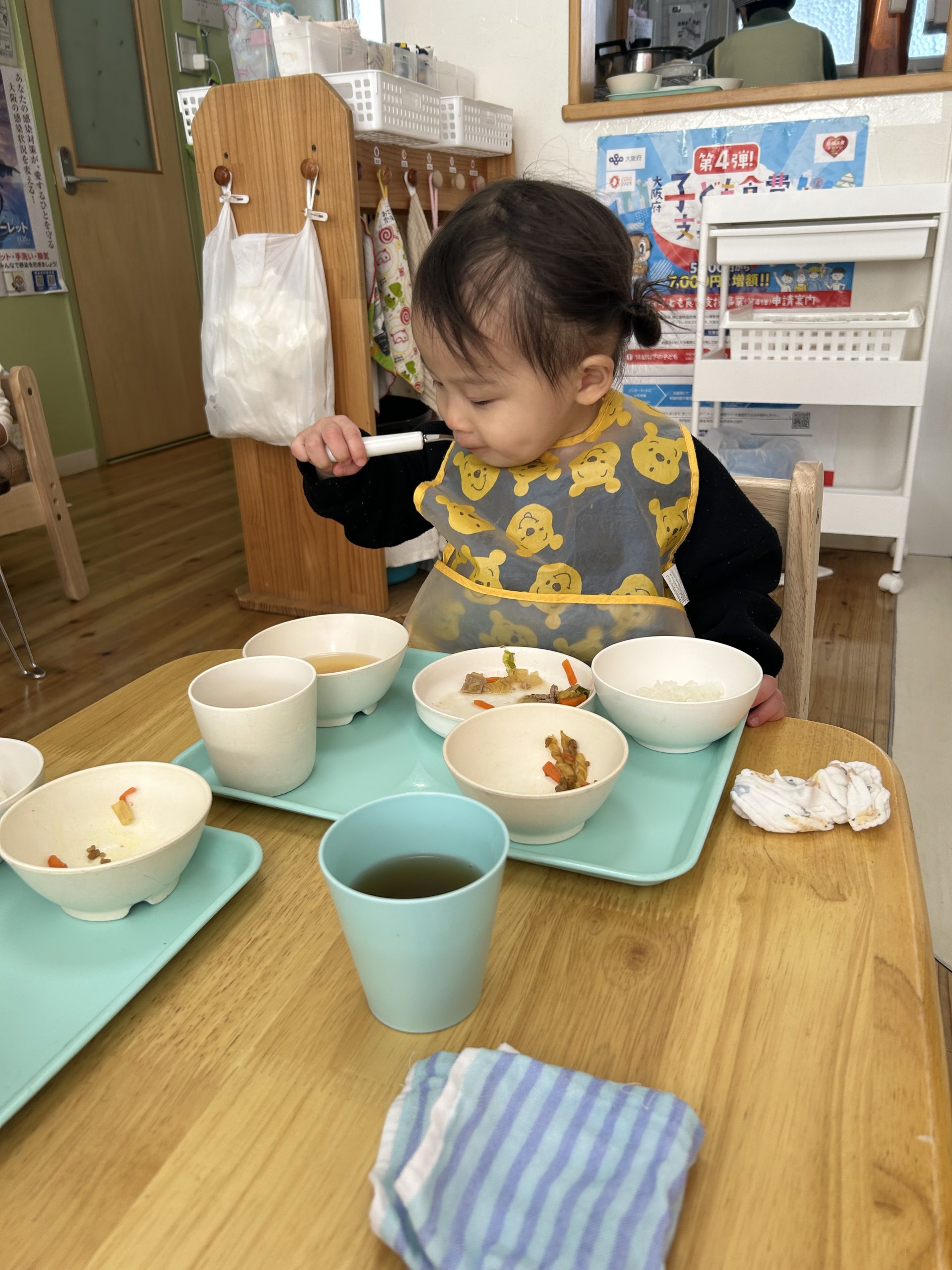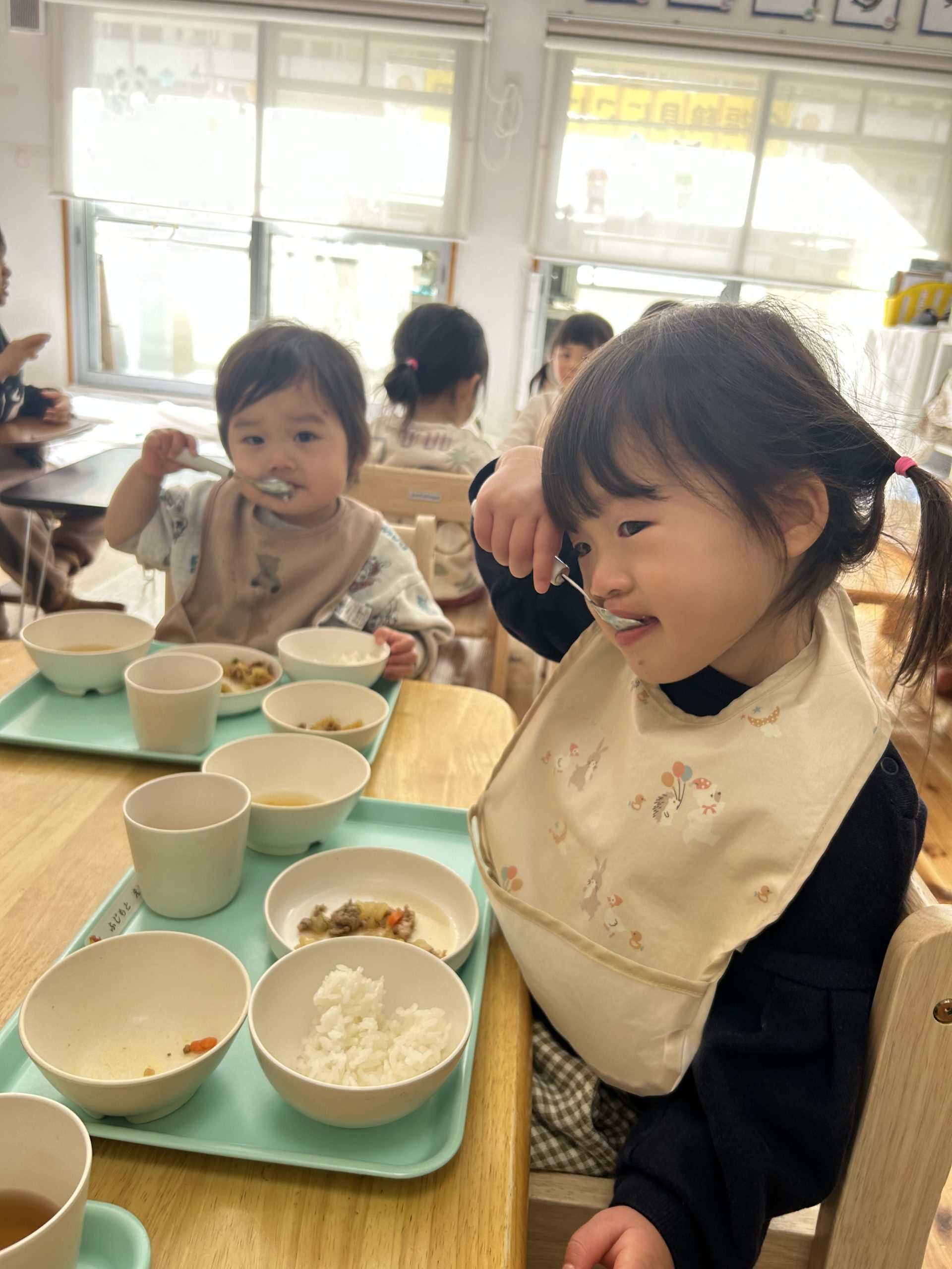 この日の給食は白菜のうま煮、マカロニのカレーソテー、味噌汁でした。2歳児さんは上手に食べることができるようになり、エプロンをつけずに食べています❣️