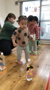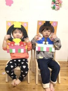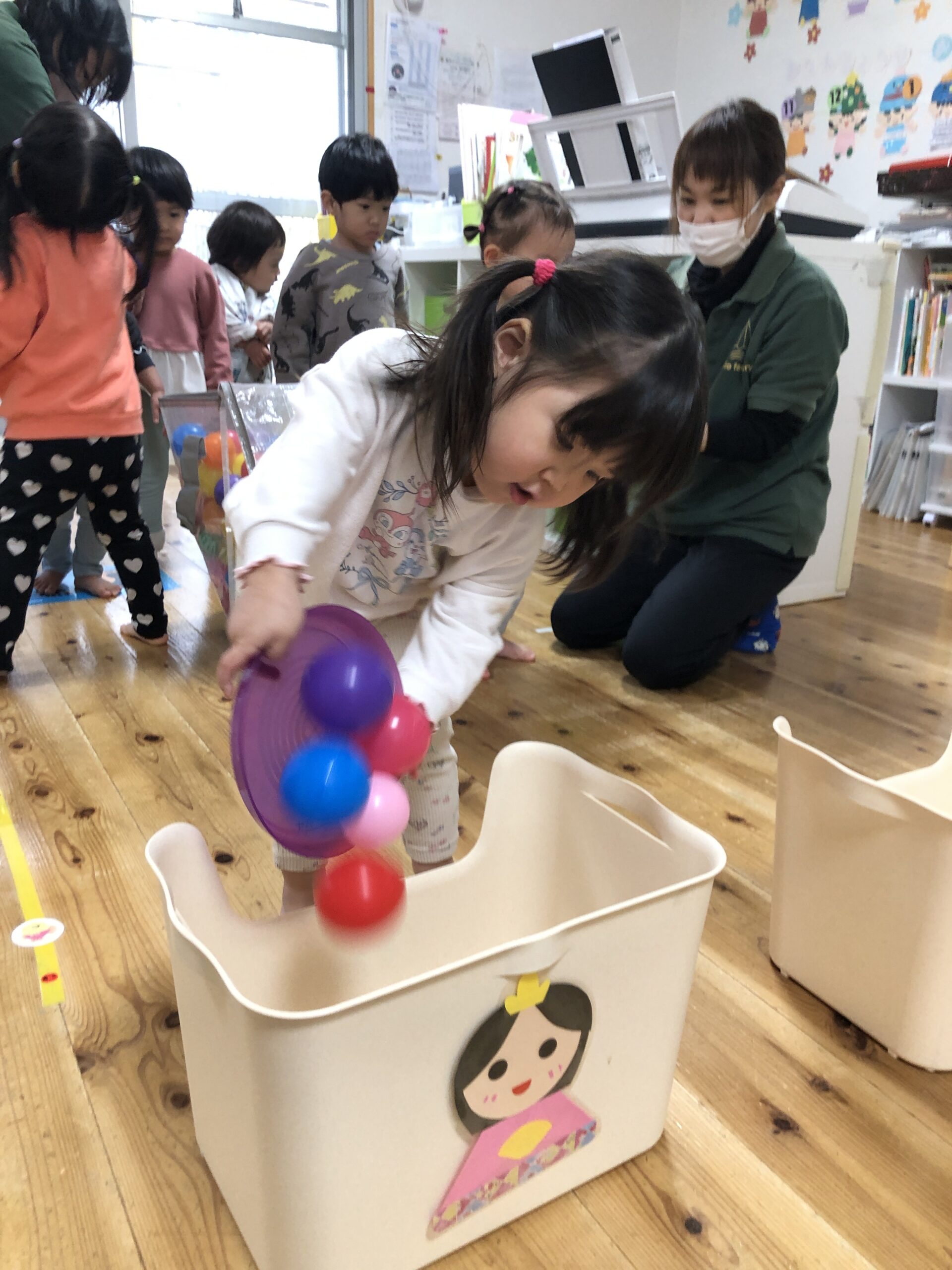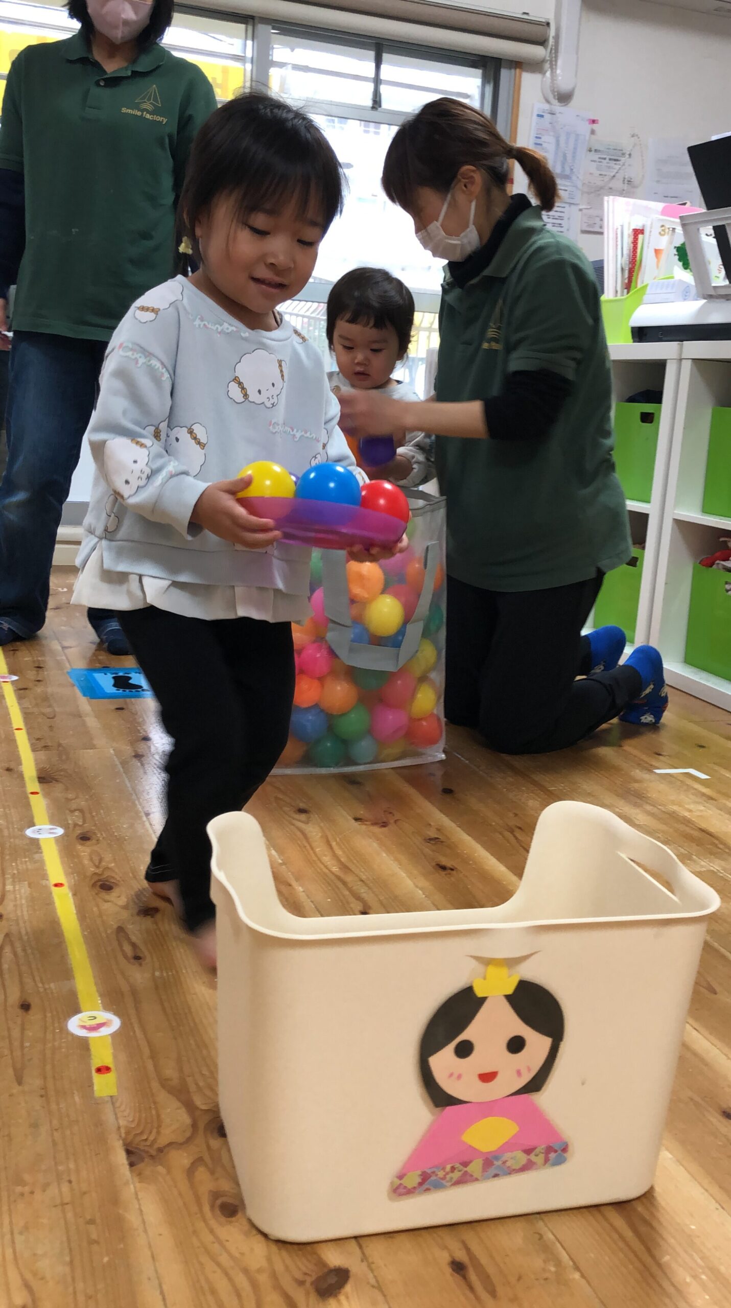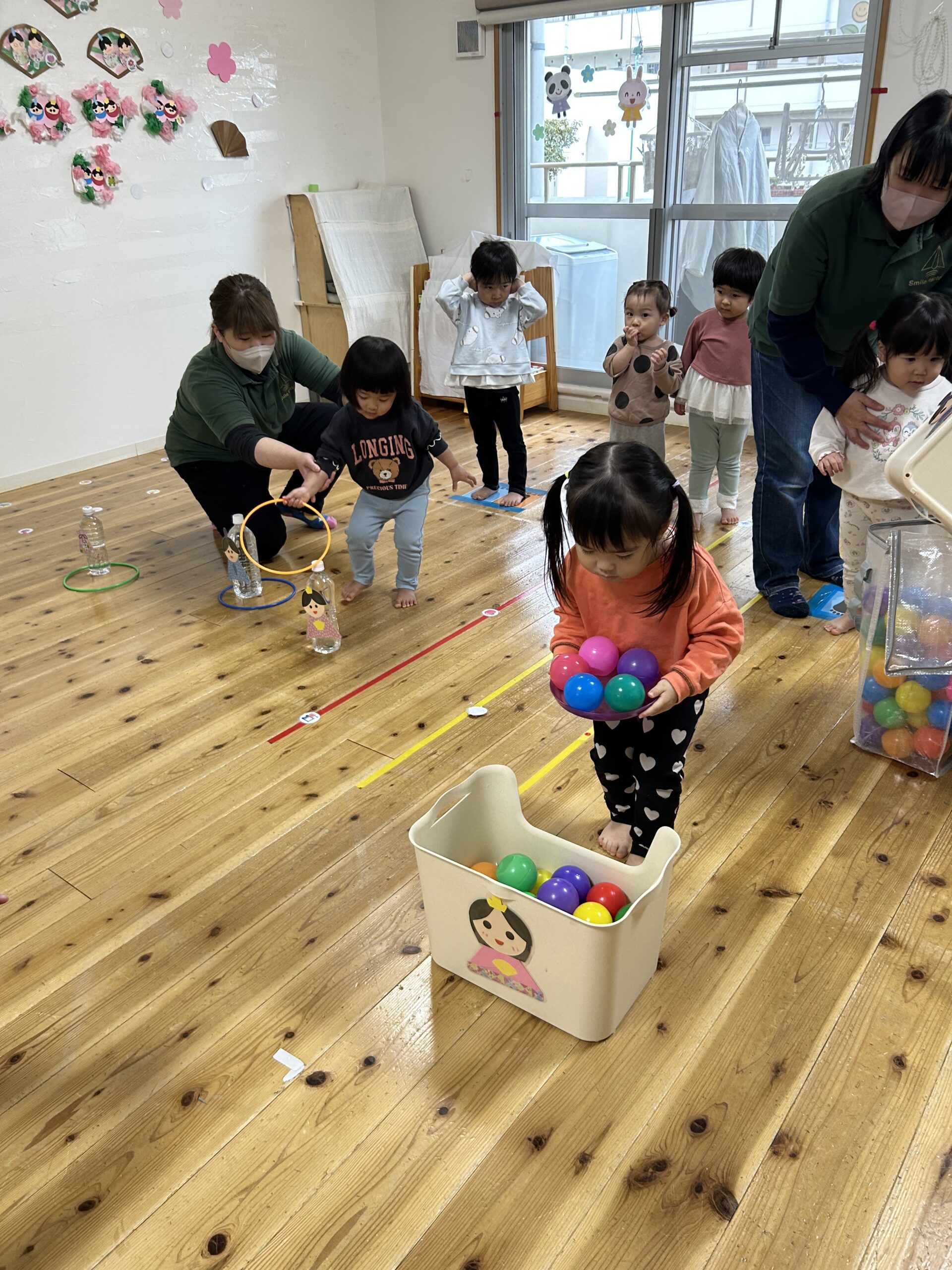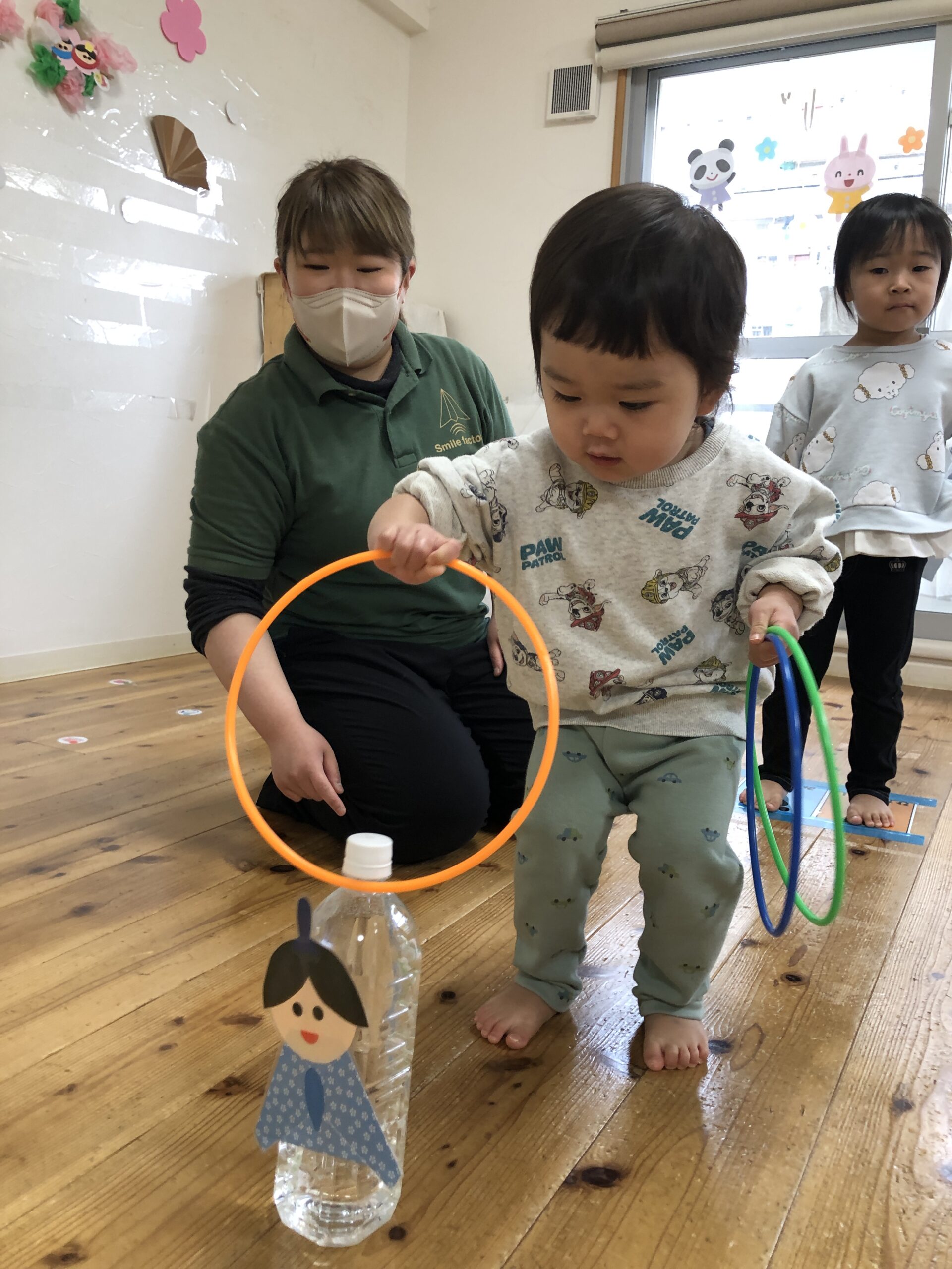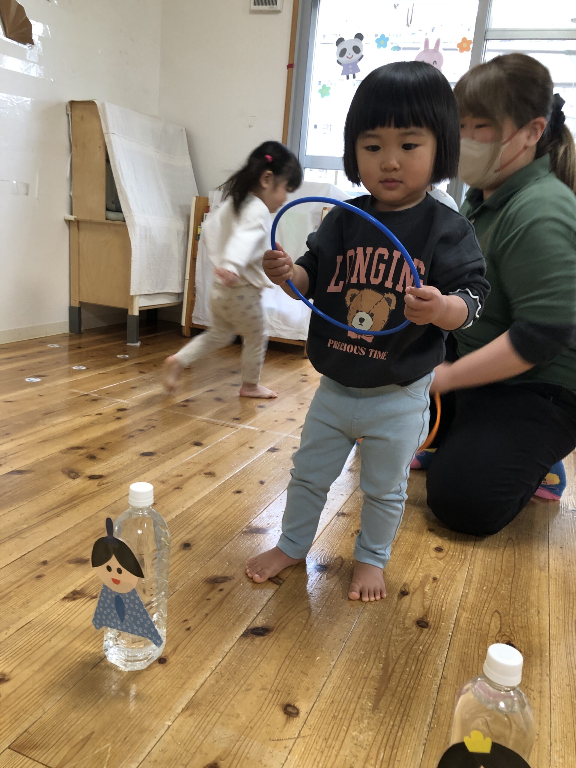 ペープサートでひな祭りのお話を聞いてから輪投げやボール入れをして遊びましたよ♪