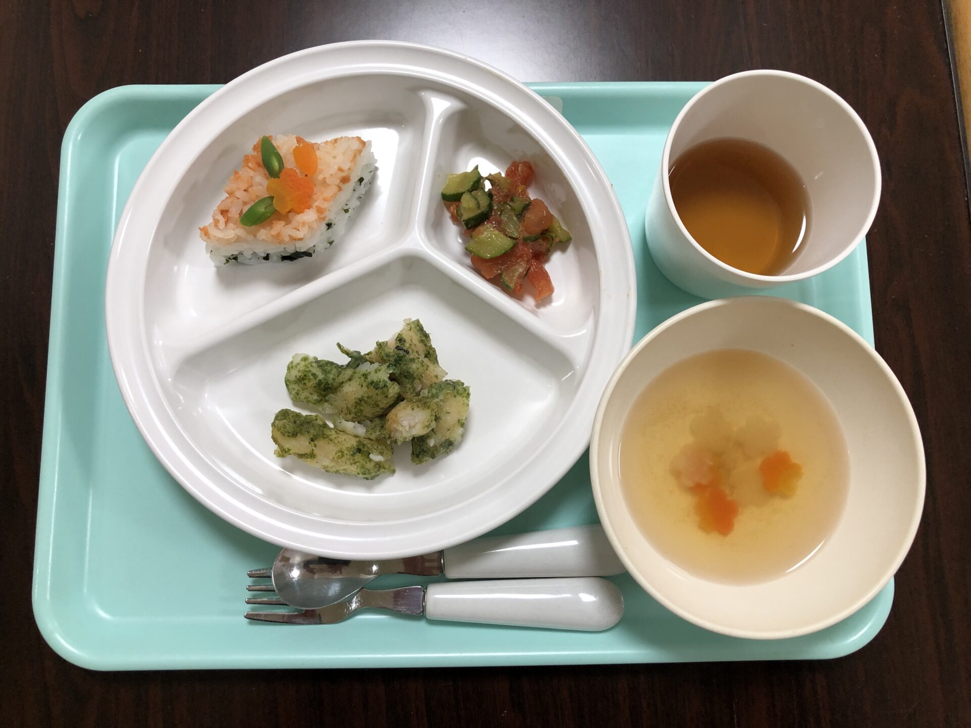 給食はひしもち風ご飯と白身魚の磯辺揚げ、トマトときゅうりのごま和え、すまし汁でした。