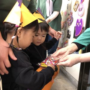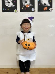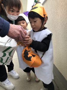仮装して、かぼちゃのカバンを持って行き、お菓子を入れてもらい、嬉しそうな子どもたちでした🎃