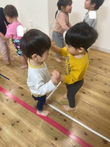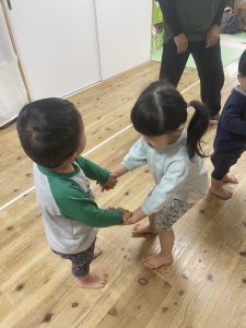 自分たちで握手するお友だちを見つけてにこにこ笑いながら楽しく手をつないでいました。