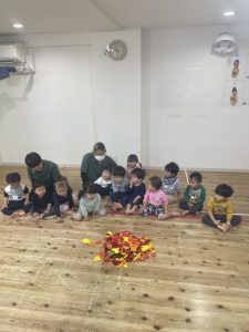 寒くなってきたので焚火ごっこもしました。焚火の中に折り紙で作ったさつまいもを焚火の中に入れて