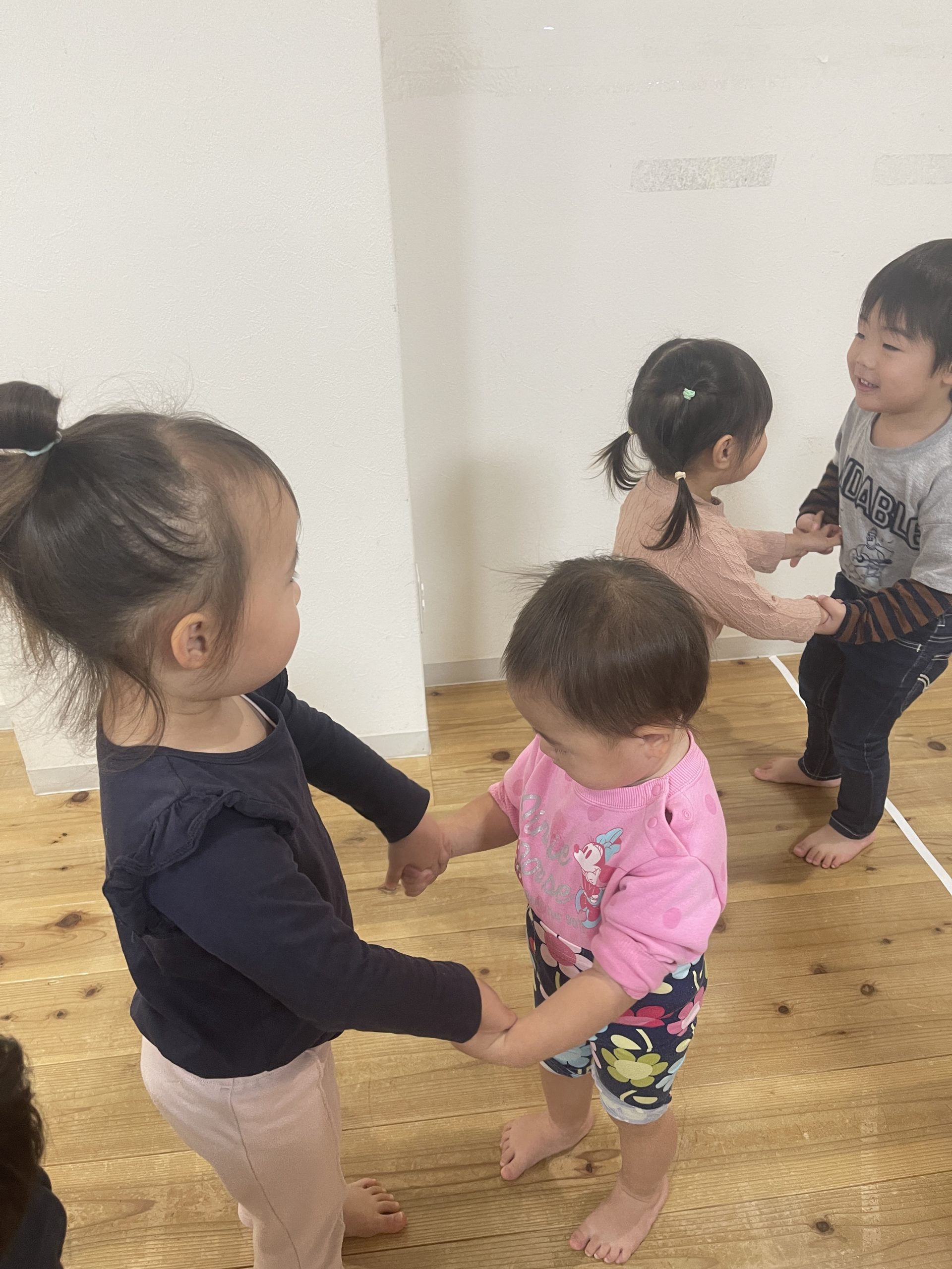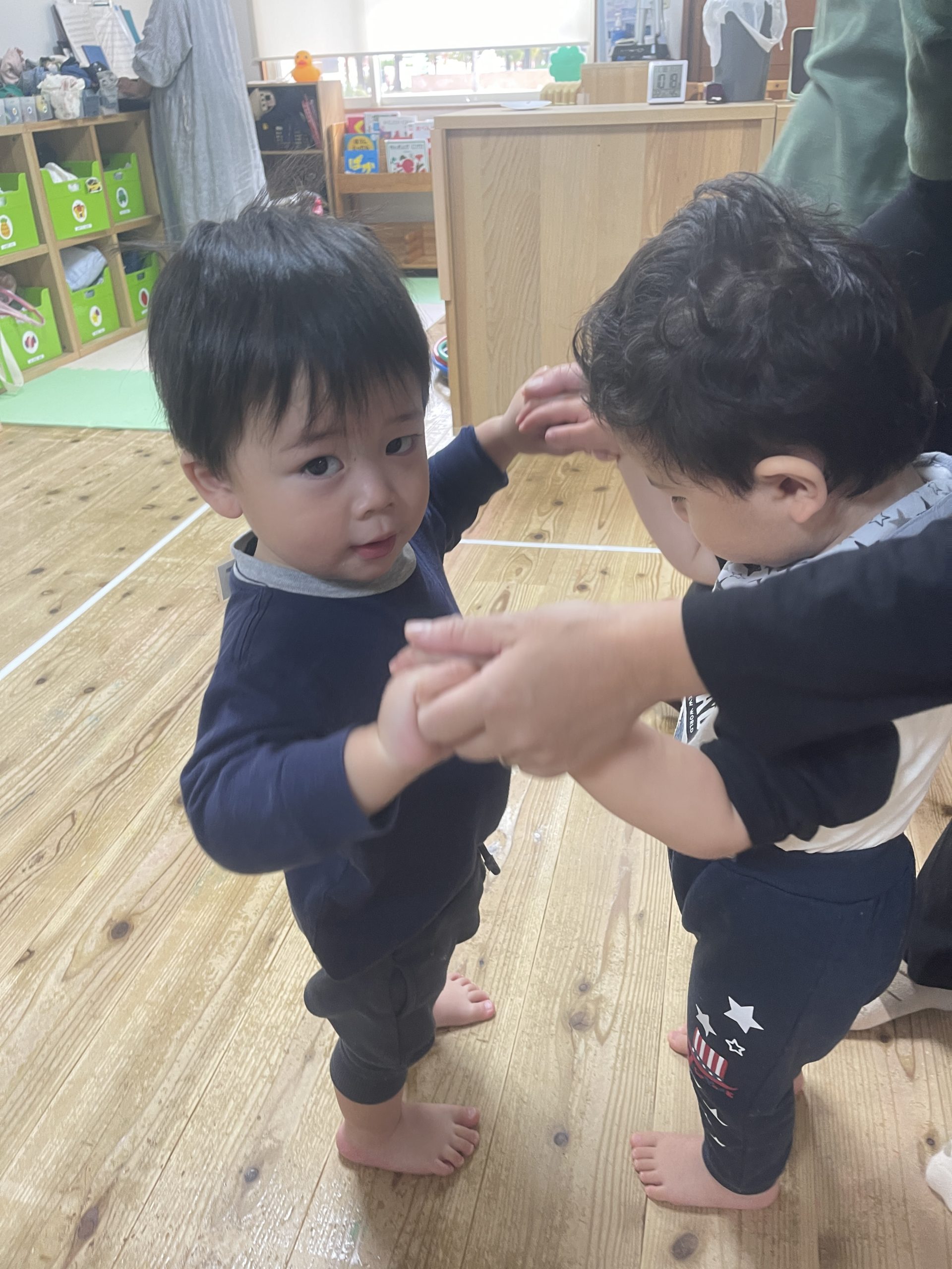 自分たちで握手するお友だちを見つけてにこにこ笑いながら楽しく手をつないでいました。