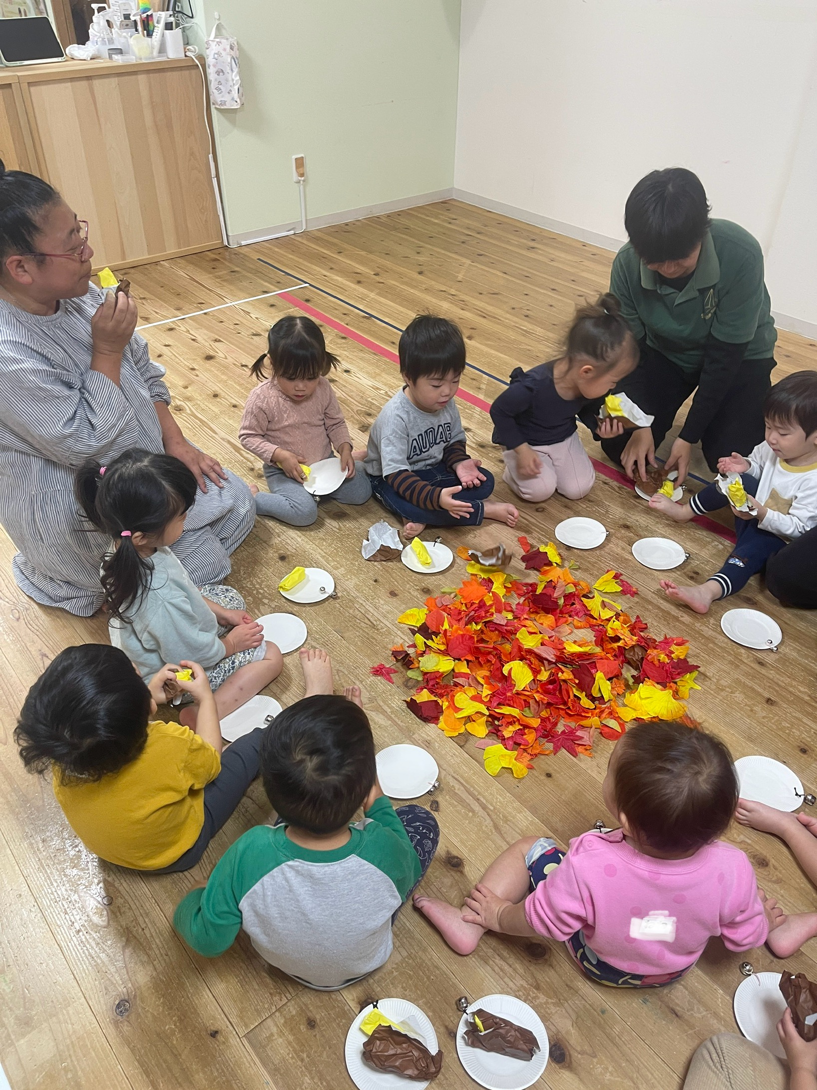 寒くなってきたので焚火ごっこもしました。焚火の中に折り紙で作ったさつまいもを焚火の中に入れて